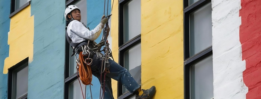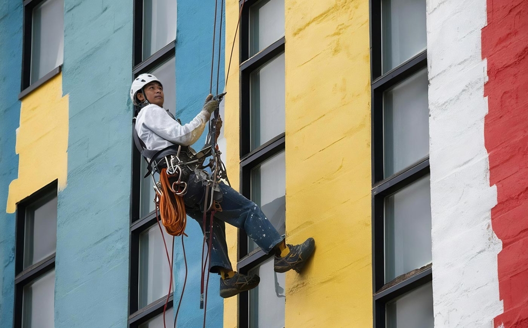 In today’s architectural landscape, building exteriors are no longer just structural elements—they are statements of identity, design, and innovation. The image above captures a skilled rope-access technician working on a vibrant, multi-colored facade, highlighting both the complexity and craftsmanship involved in modern exterior finishing.